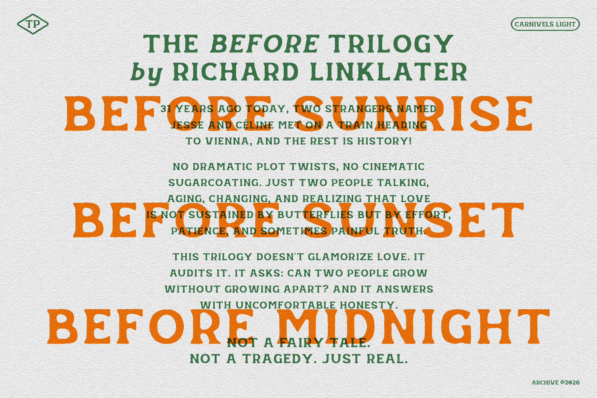 I built Carnivels Lights from an obsession with old print textures and imperfect ink. I didn’t want a clean serif. I wanted something that feels touched, shaped, slightly unruly. Something that carries weight without screaming.